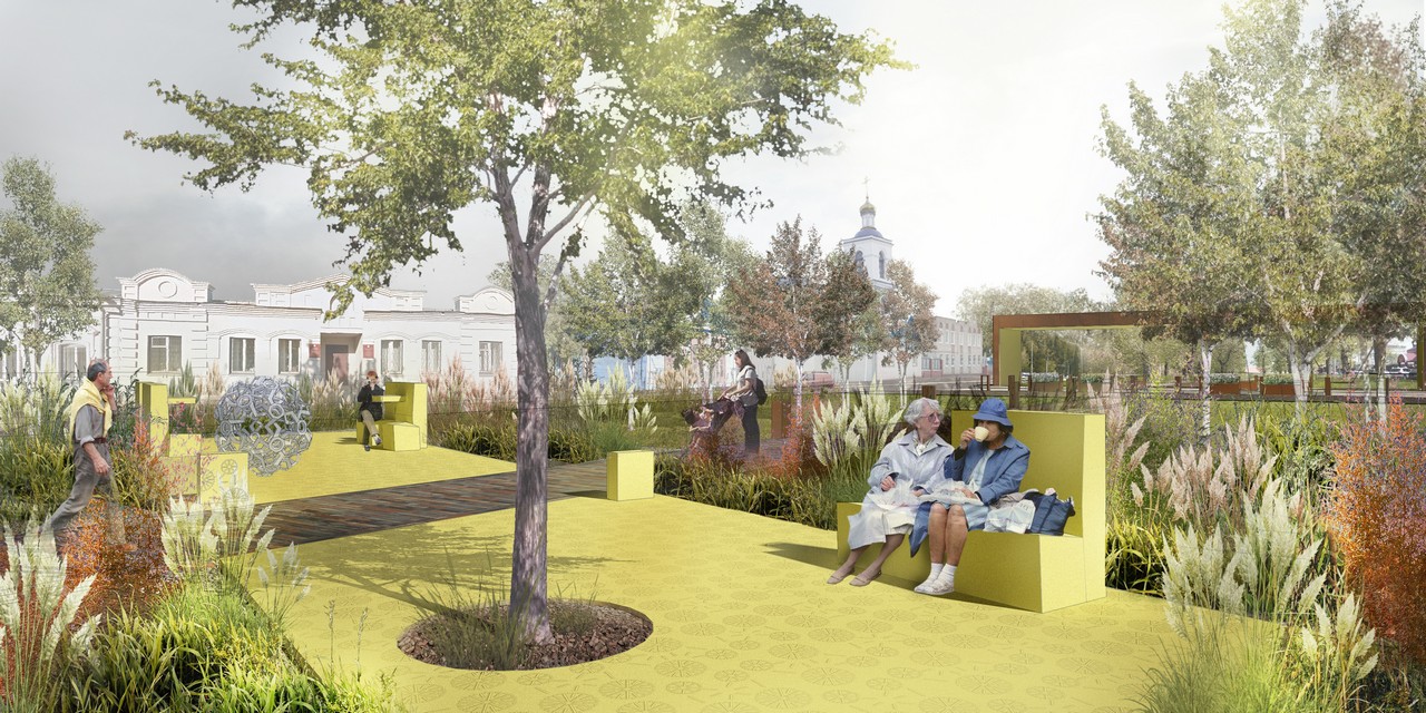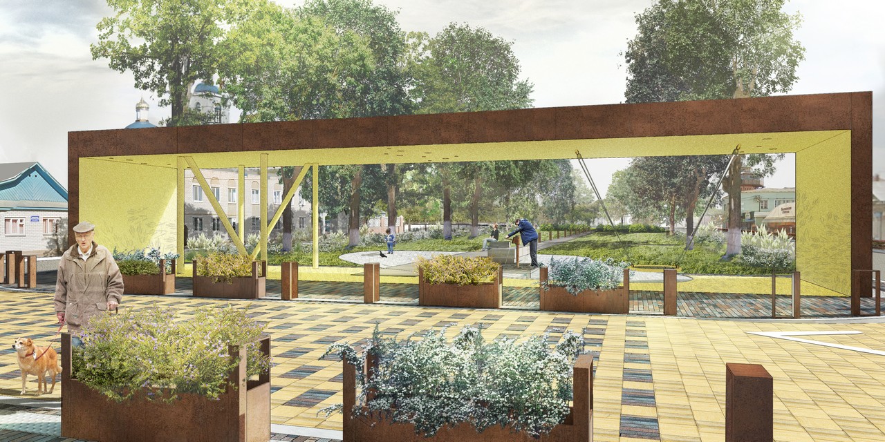 Три площади с навесами и павильонами, тематические кулуары, серия малых архитектурных форм и дизайн оборудования отсылают к важным смысловым аспектам жизни и истории города: агрокультура, часовой завод «Восток», велокультура и компоненты умного города.