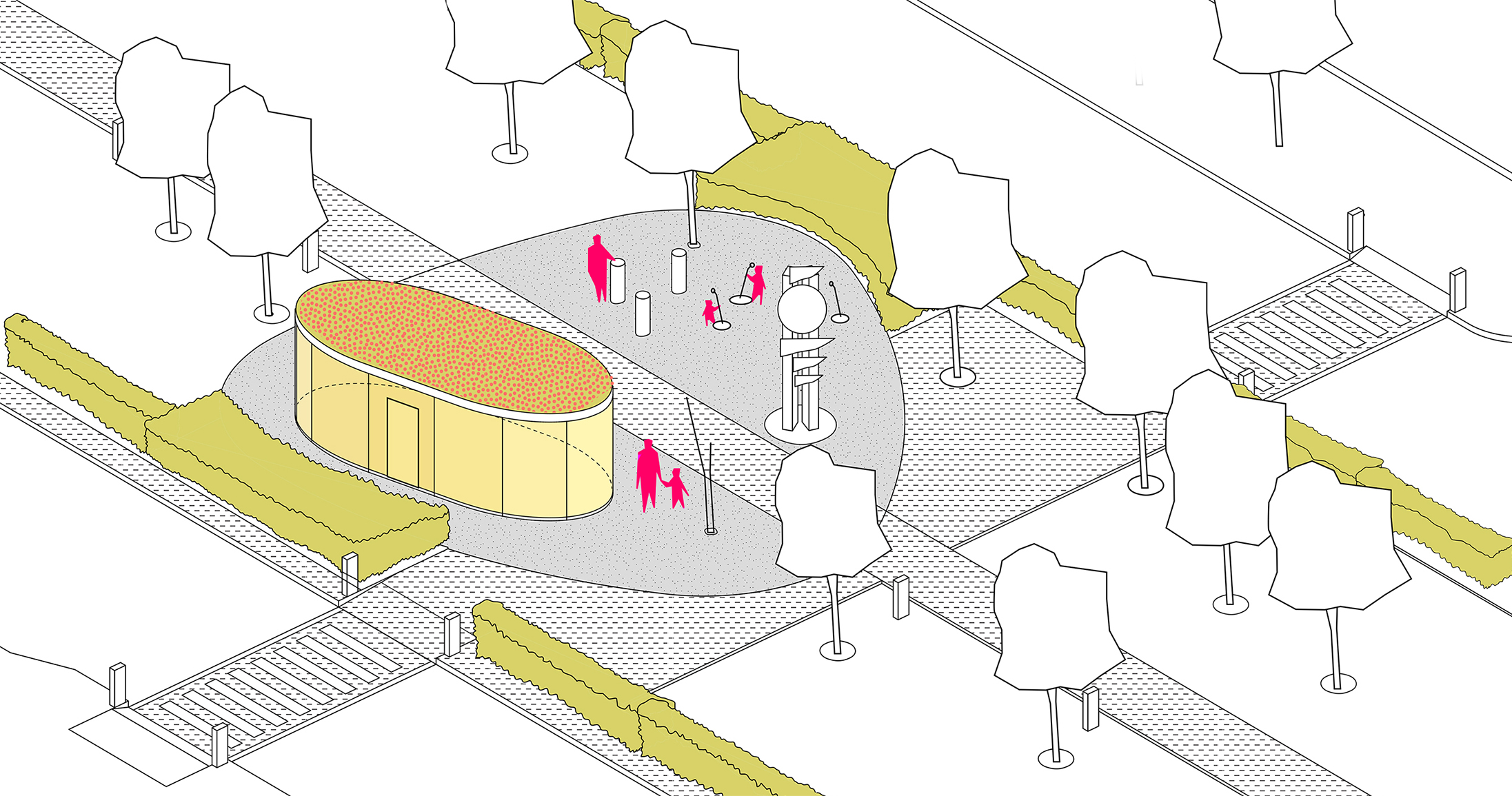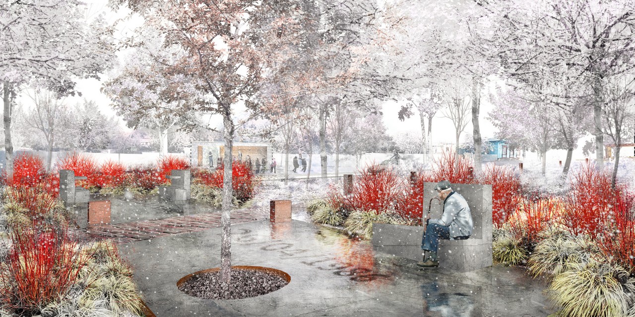 Площадка отдыха на оси бульвара между автобусными остановками - узел туристического маршрута в мемориальном сегменте бульвара. Сюда помещается стела основания Чистополь и размещаются мирные общественные функции: минимальное оборудование для самых маленьких, павильон торговли и городской туалет.