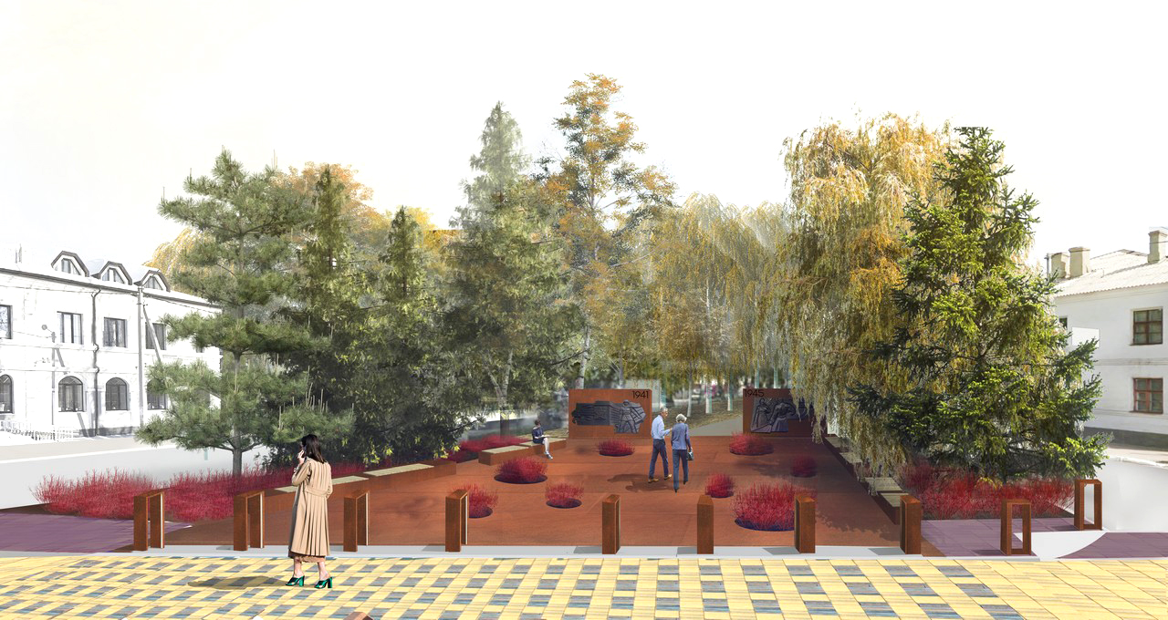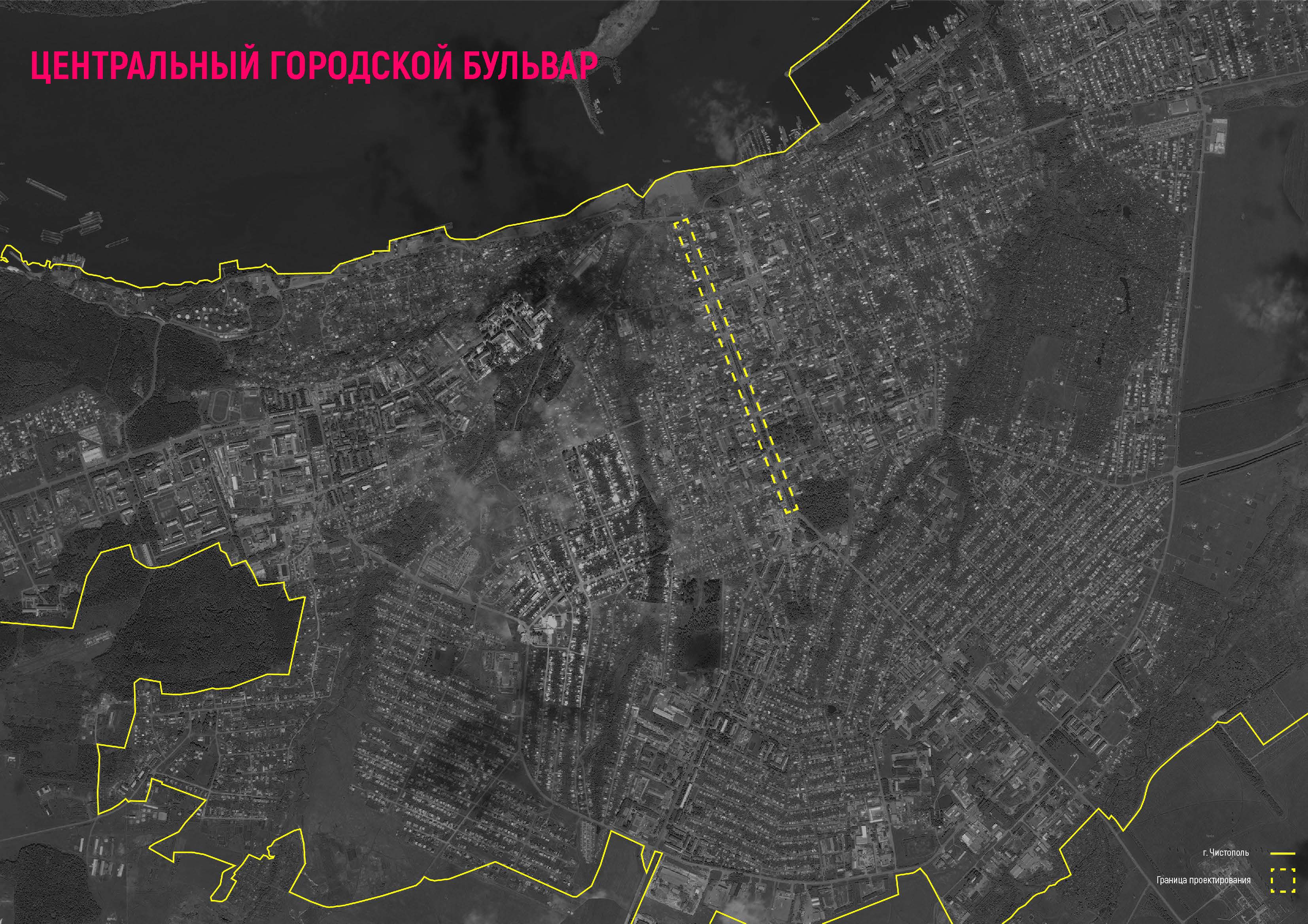 Вторая итерация развития центрального городского пространства - Центральный бульвар по улице Карла Маркса фаза#1 - тематический переход от мемориалов военных лет к достижениям мирного времени. Этот важнейший сегмент включает два кулуара, посвященных памяти жертв мирного времени - Чечено-Ингушского конфликта и Чернобыльской катастрофы, в которых приняли участие сотни чистопольцев, это живая актуальная история города.