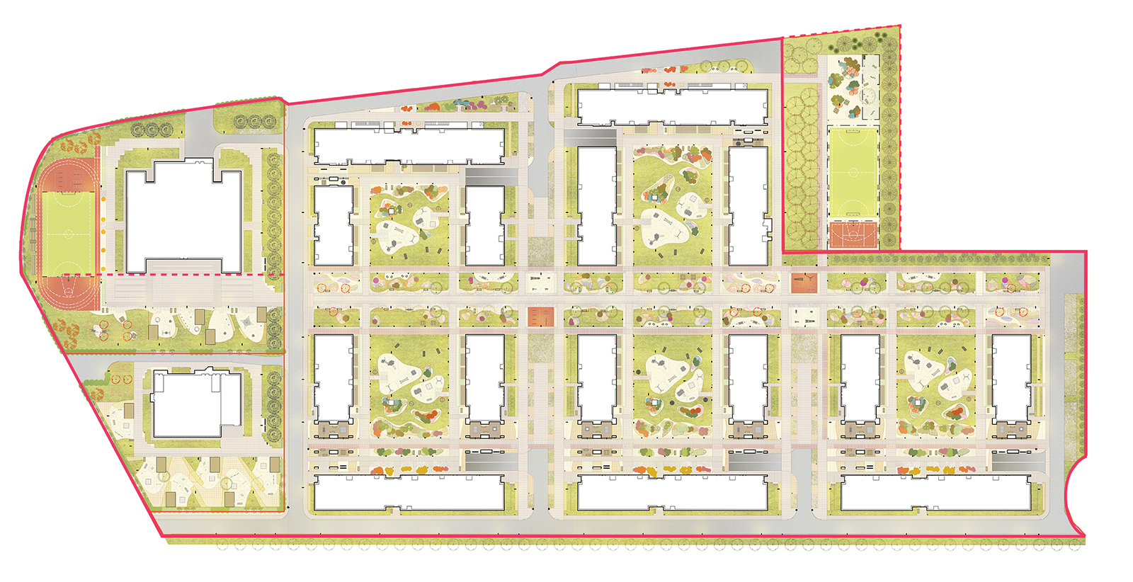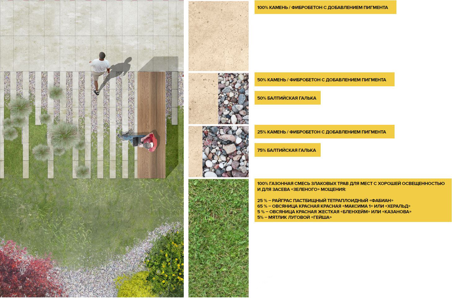 Балтийская галька выбрана из-за широкого диапазона цветового и тонового спектра. Форма игровых площадок образуется агрегированным абрисом зон безопасности игрового оборудования площадок. Для удобства доступа площадок в демисезон к ним проложены дорожки дискретного мощения по аналогии с мощением центральной аллеи. Газонные покрытия, равно как и посадки кустов, со всех сторон фланкированы поясами отсева шириной 400мм для соблюдения технологии «швейцарского газона».