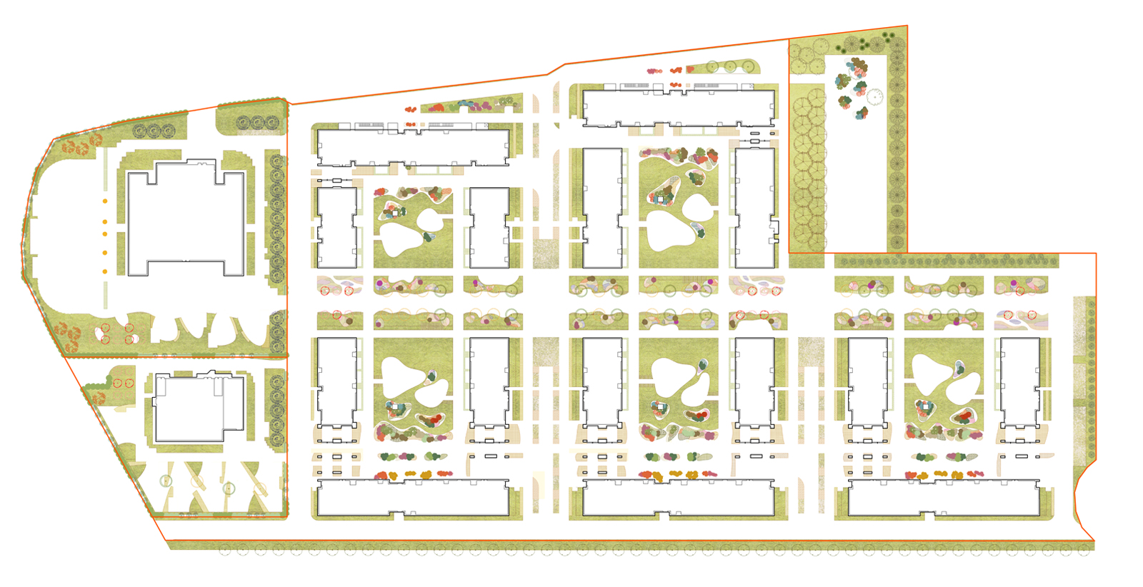 - Входы и выходы из дворов жилого района комплекса фланкированы симметричными группами черешен (дерево черешни отличает высокая декоративность: бурное цветение весной, сочная оранжевая листва осенью, зимой многие ягоды остаются на ветвях). Видовой состав черешен подобран так, чтоб их было не менее трех в ряду и их сорта чередовались, что повышает их вегетативный потенциал на протяжении жизненного цикла.