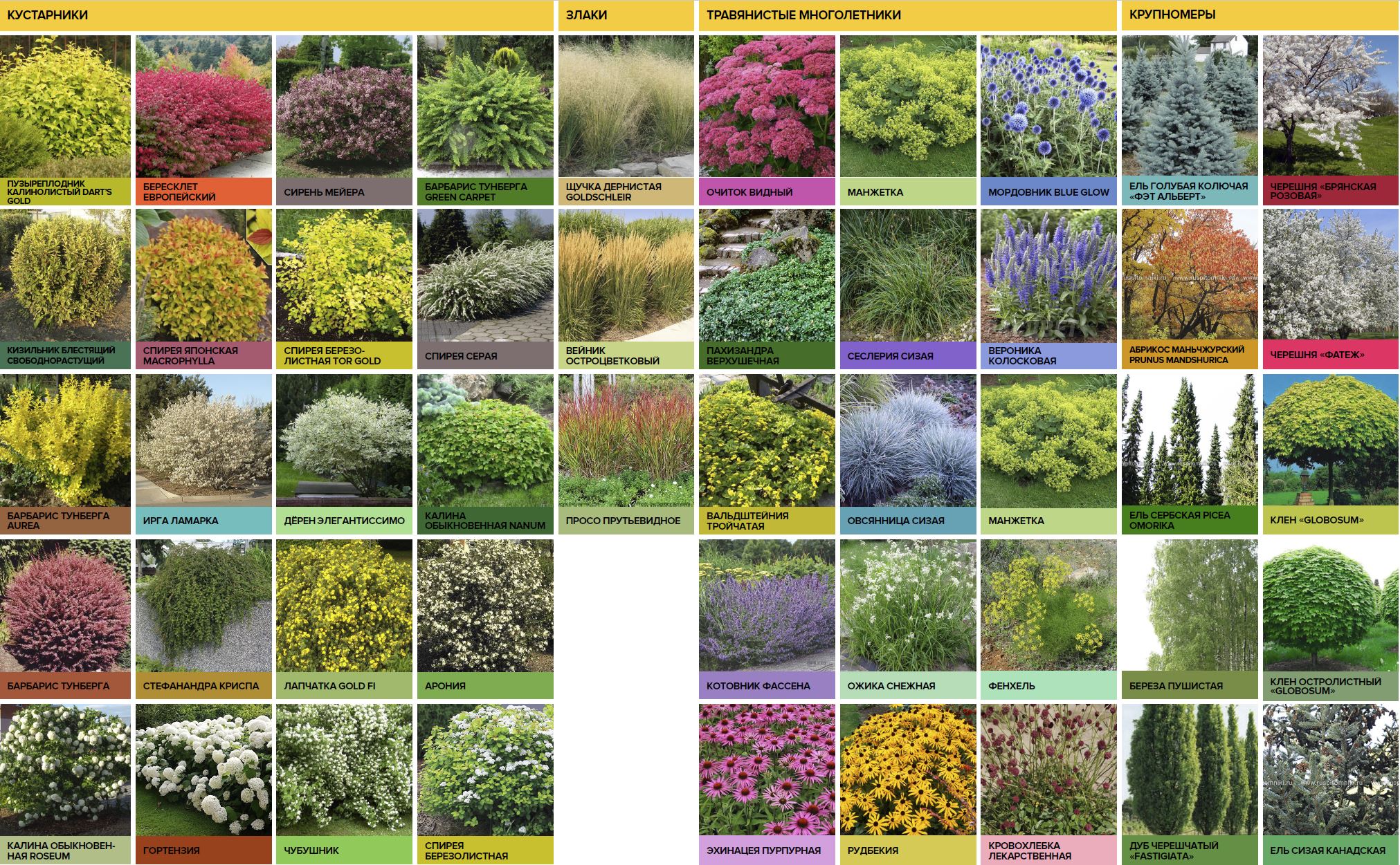 Композиции средневысоких кустов и состав изгородей палисадников подбираются так, чтобы максимально поддерживать сезонное цветовое разнообразие [цвет веток / листьев / соцветий / цветов / плодов / побегов].