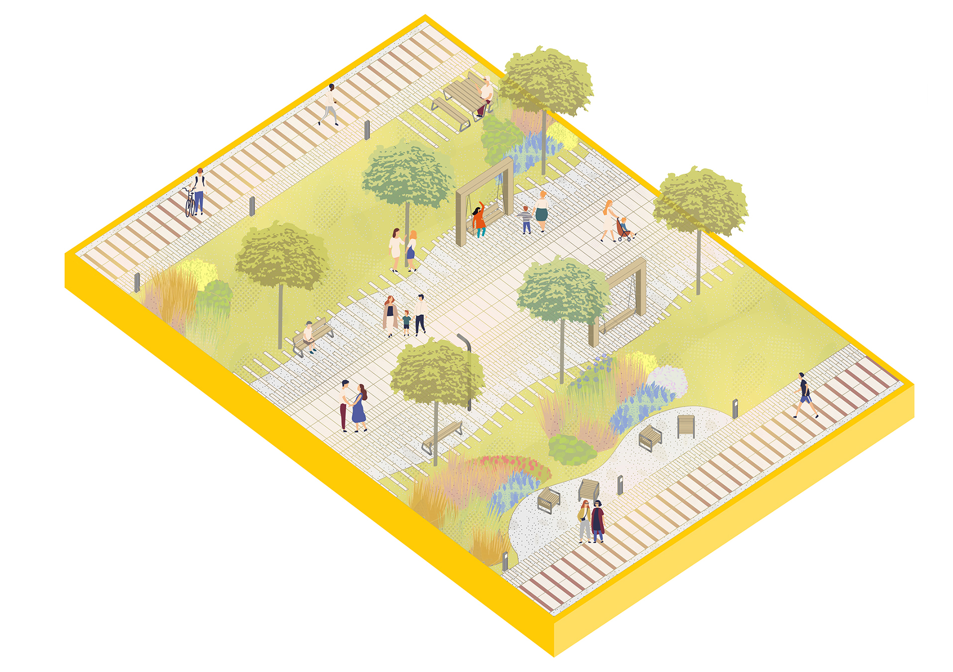 Функционально центральная аллея представляет собой выделенную центральную ось пешеходных прогулок с маркированной полосой велодорожки. Её с обеих сторон окружают микрофункциональные зоны с микромаршрутами - площадки игры в петанк, площадки воркаутов, качелей, зон со столами для отдыха, игры в настольный теннис, батутами и пр.