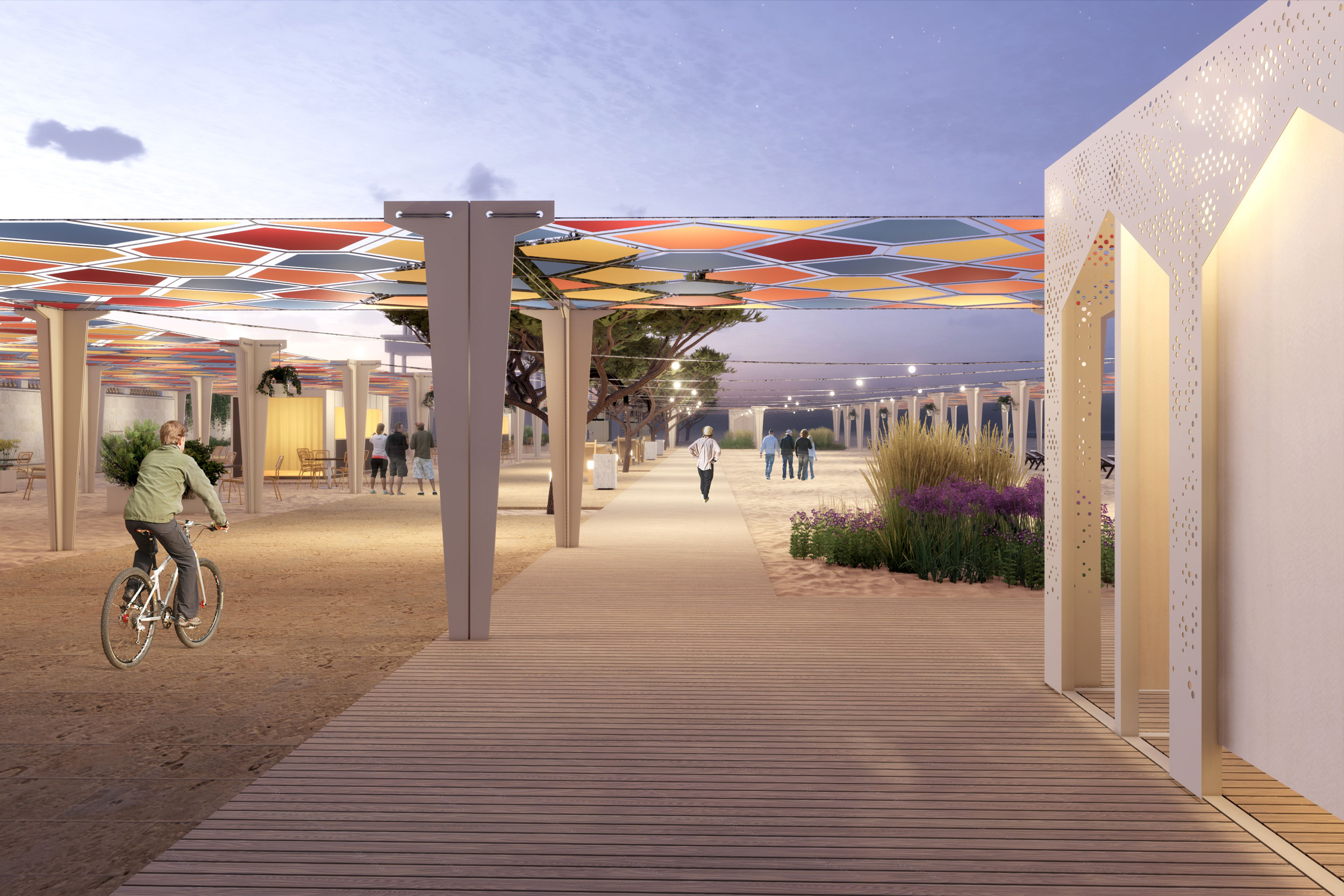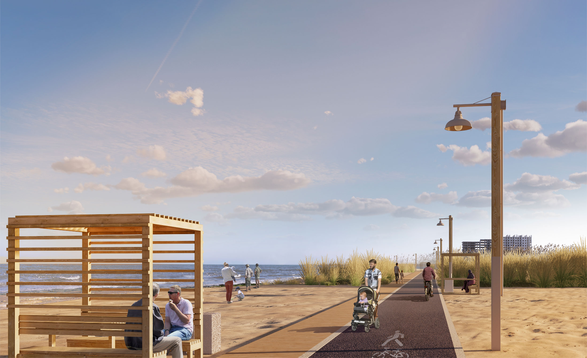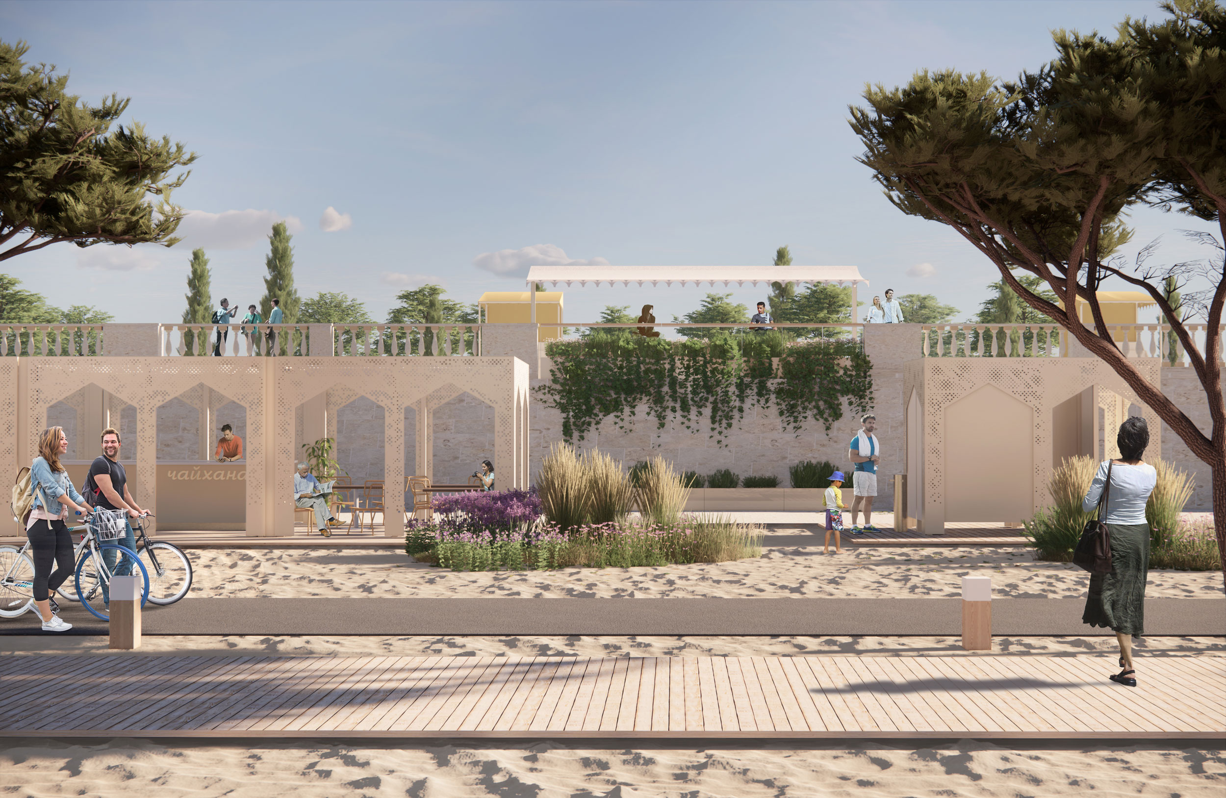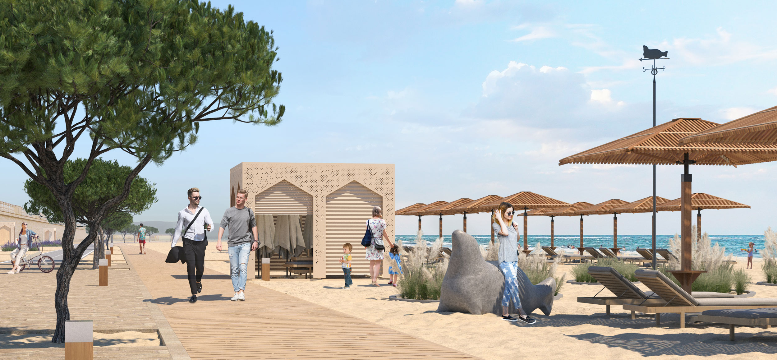Дизайн пляжной зоны предполагает обстоятельное функциональное зонирование. Вдоль Городского пляжа появится прогулочная дорожка из деревянного настила под кронами сосен и веломаршрут. Прогулка вдоль Каспия станет комфортной как днем, так и в вечернее время благодаря подсветке крон деревьев и боллардам освещения.
