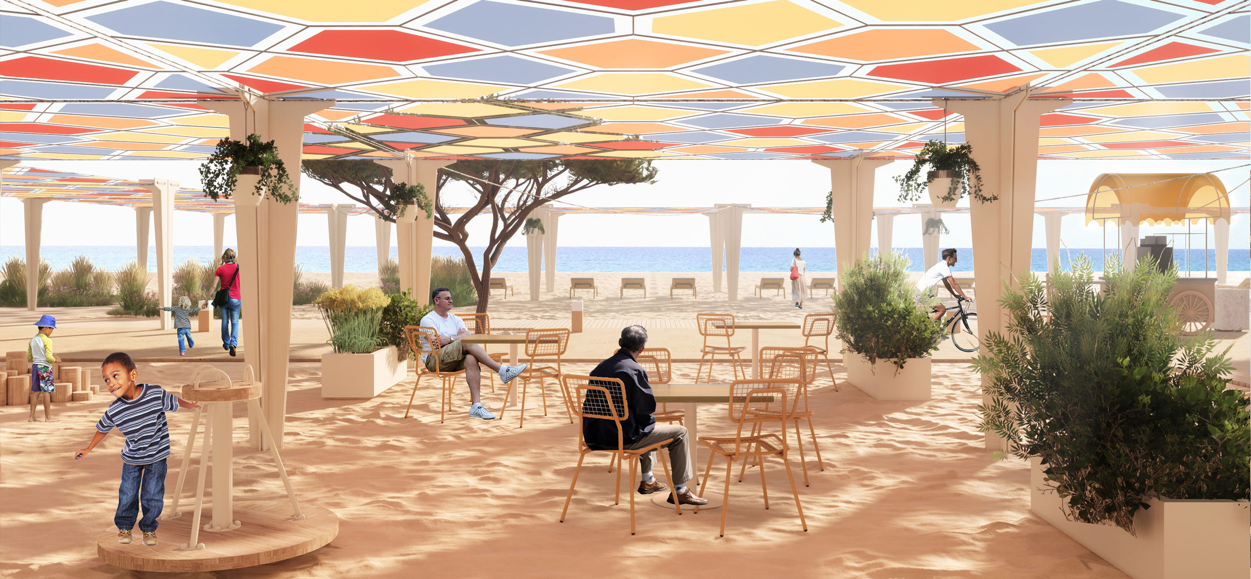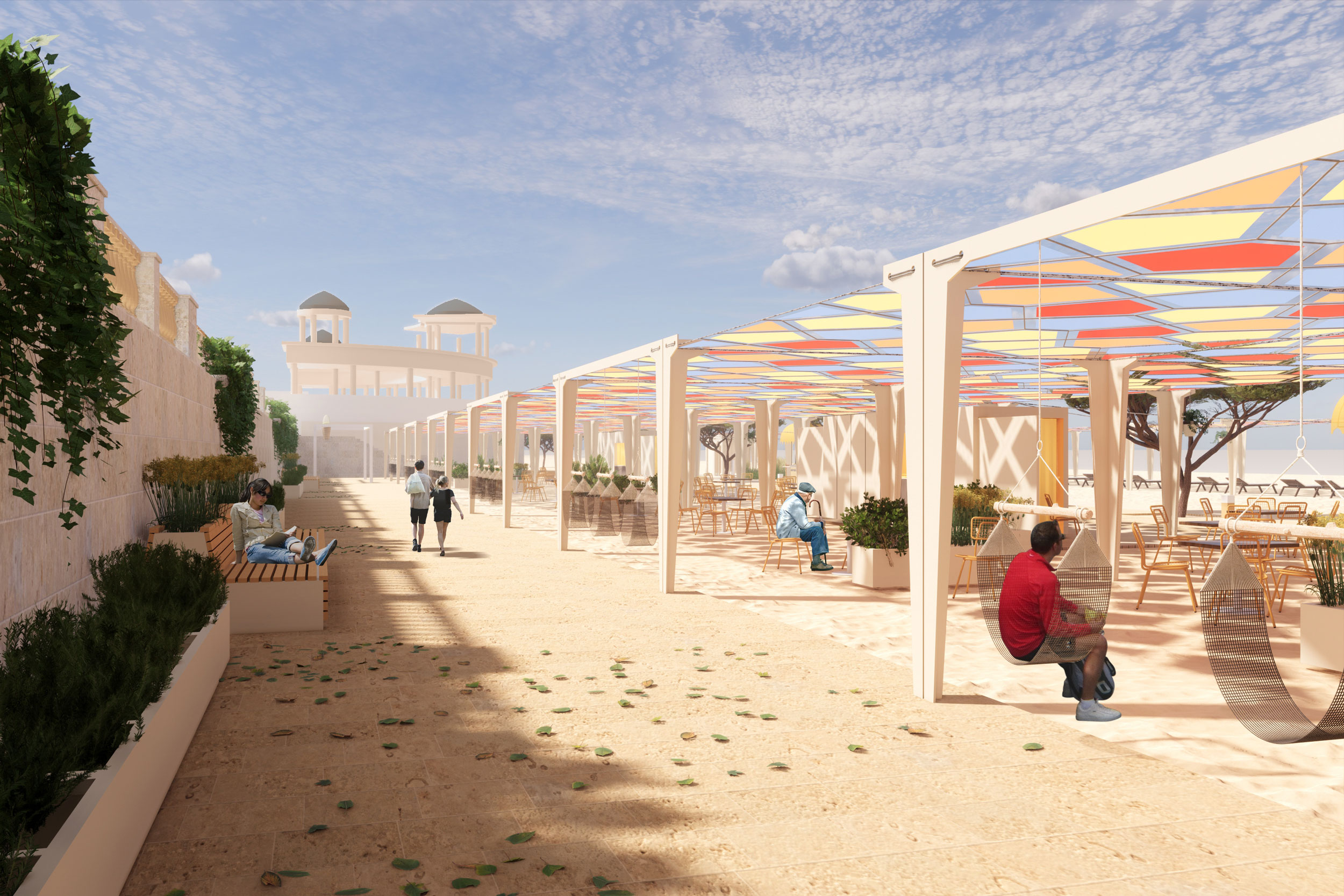 Центральным объектом Городского пляжа станет большая теневая галерея из ярких тканей в зоне спуска из Приморского парка. В галерее разместятся чайные, зоны отдыха и детских игр. Теневая галерея будет служить функциональным продолжением Приморского парка, дополнительной площадкой для праздничных событий и мероприятий города.