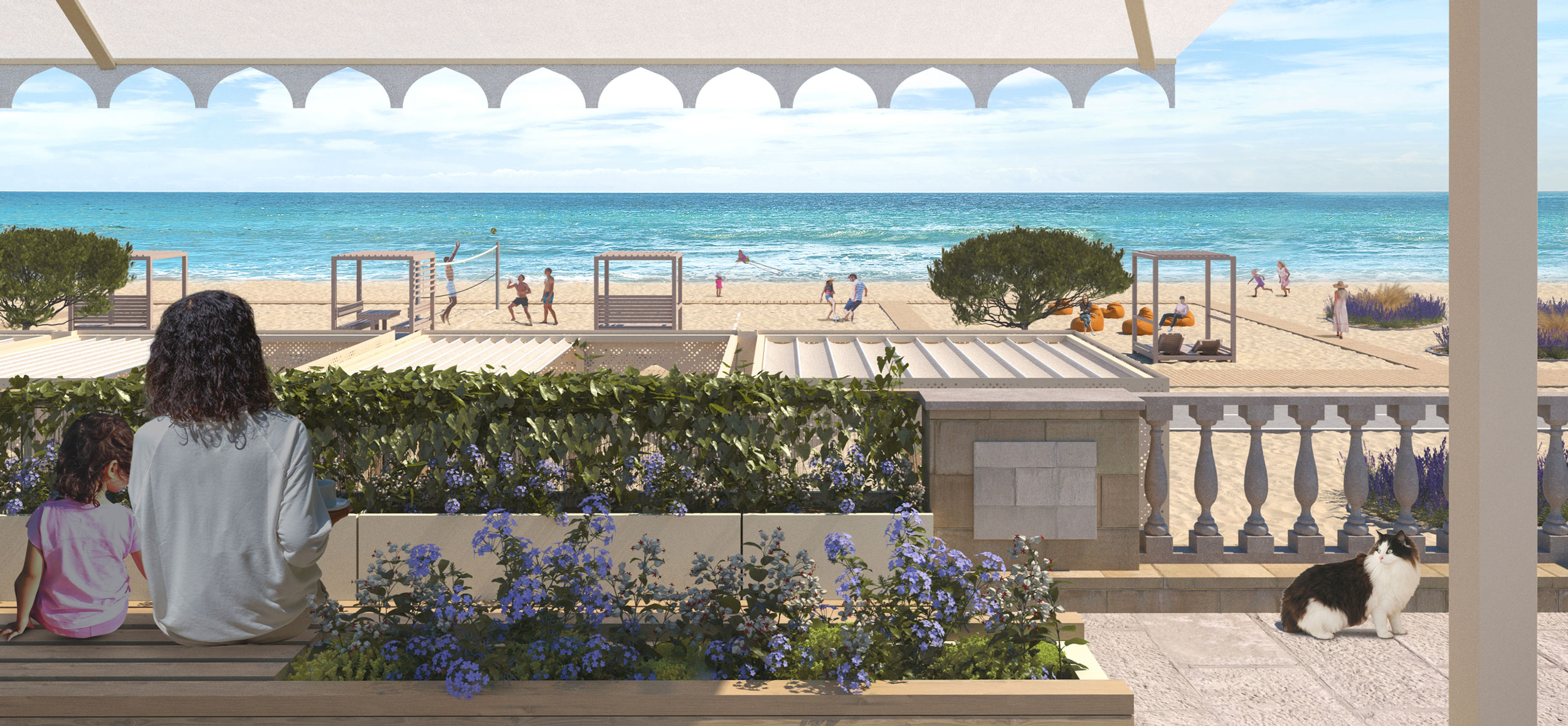 Для любителей активного отдыха будут оборудованы зоны пляжных игр. На пляже можно поиграть в пляжный волейбол, футбол, настольный теннис. В северной части пляжа появится выделенная зона проката водных аттракционов и станции сапсерфа. А наблюдать за игрой можно будет в тени маркиз в верхнем парке, где предусмотрены деревянные амфитеатры с редизайном существующего ограждения по сегментам в видовые площадки “зеленые” кашпо.