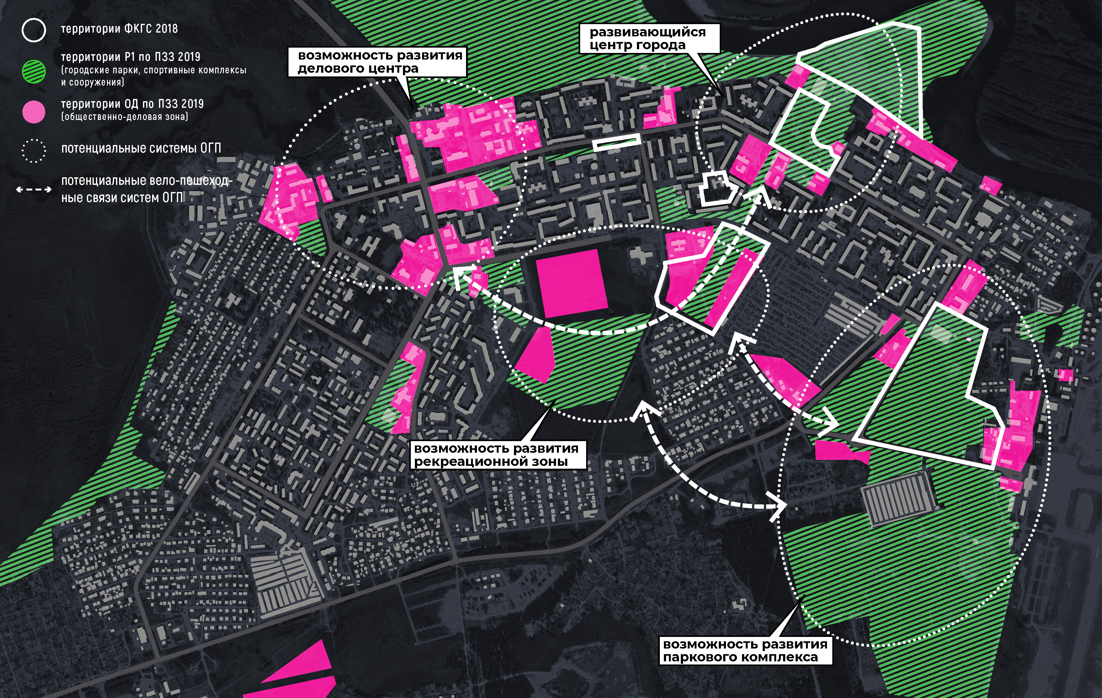 На основании градостроительных документов и предложений горожан, поступивших в 2018 году при проведении мероприятий приоритетного проекта ФКГС, была сформирована схема общественно-деловых и рекреационных зон города. Дистанционный анализ данных позволяет говорить о наличии четырех потенциальных систем открытых городских пространств (далее ОГП), для формирования которых необходимы вело-пешеходные связи.
