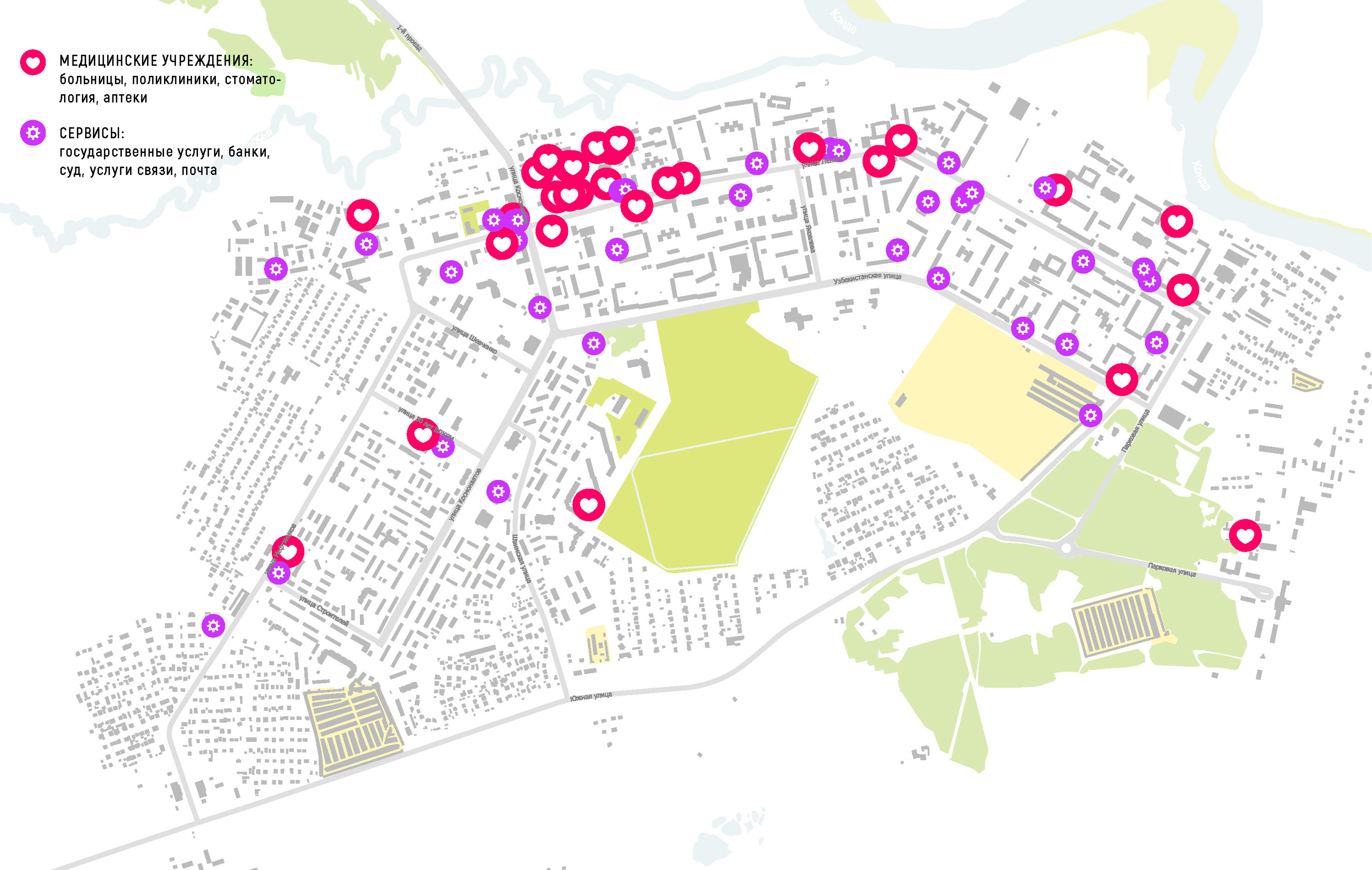 На основании собранных данных о городе Урай, включая расположение объектов интереса различной частоты использования, а также мест пребывания городских и местных сообществ, была произведена оценка факторов городской среды и их влияния на объекты, размещенные на территории, прилегающей к общественным пространствам. Дистанционный анализ позволяет выделить медицинский, мемориальный, спортивные и общественные центры, которые являются местами пребывания городских сообществ или большой группы пользователей, а следовательно, оказывают влияние на прилегающие территории и общественные пространства.