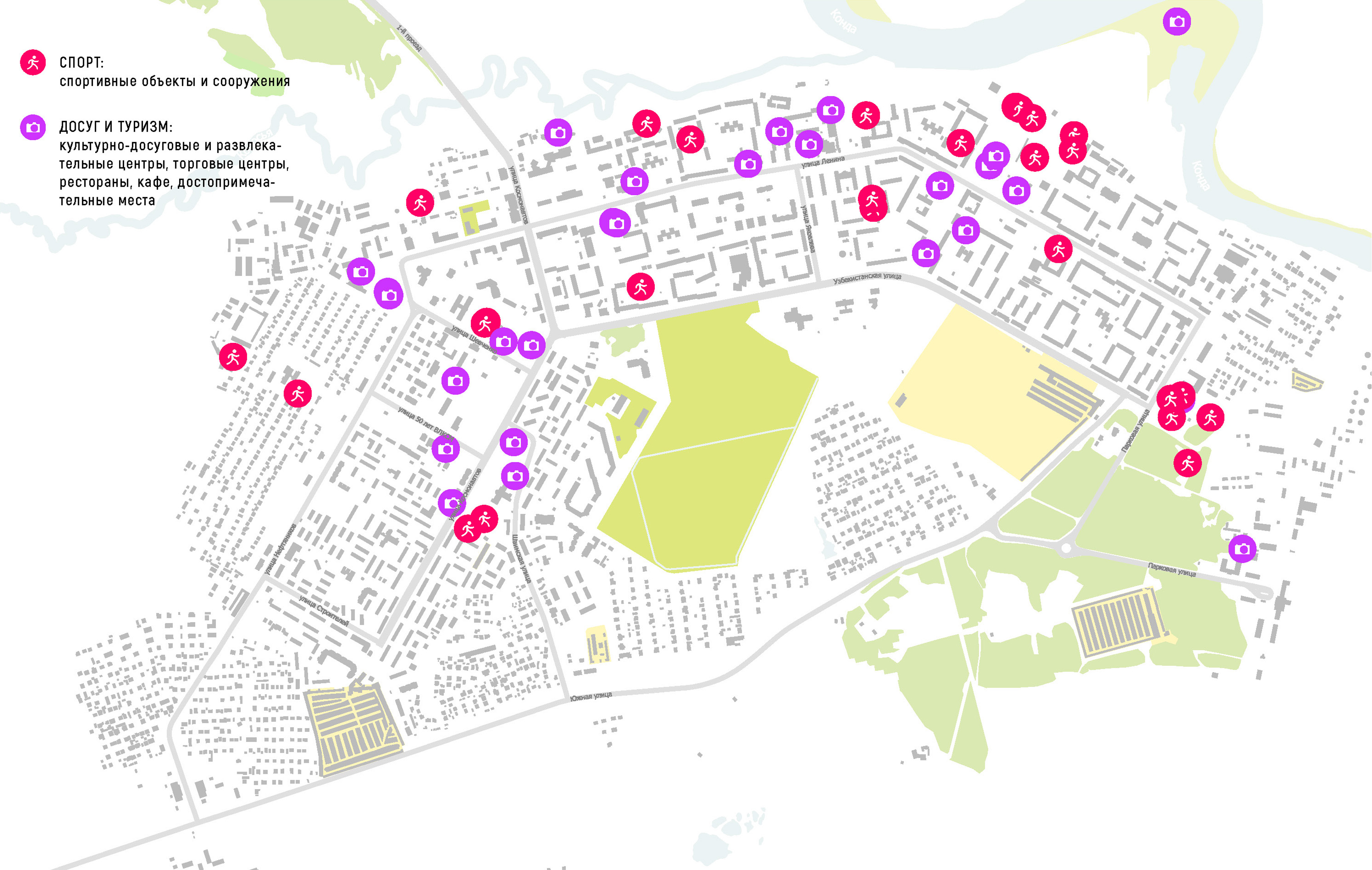 - набережная — по мнению горожан одна из наиболее популярных мест. При этом стадион «Нефтяник» является мощной точкой притяжения для молодежи всего города. Набережная как главная природная территория стала излюбленной зеленой зоной для прогулок в тишине, для наблюдения за флорой и фауной района, для любования речной долиной Конды. Вместе с территорией Спортсквера (часть парка культуры и отдыха), где можно найти точки общественного питания и необходимые инфраструктуры. Набережная — перспективная территория для развития рекреационной зоны в центре города.