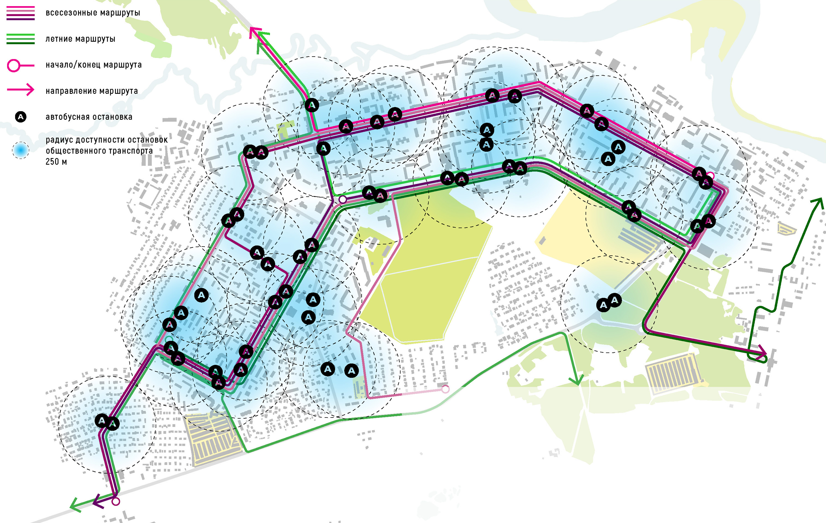 Так же обозначены негативные факторы городской среды: болото и гаражи, которые препятствуют созданию пешеходных и транспортных связей между районами юго-восточной части города. Отсутствие оборудованной транспортной и вело-пешеходной дорожной сети и разорванность городской ткани в юго-восточной части города в совокупности оказывают мощное негативное влияние на безопасность в городе.