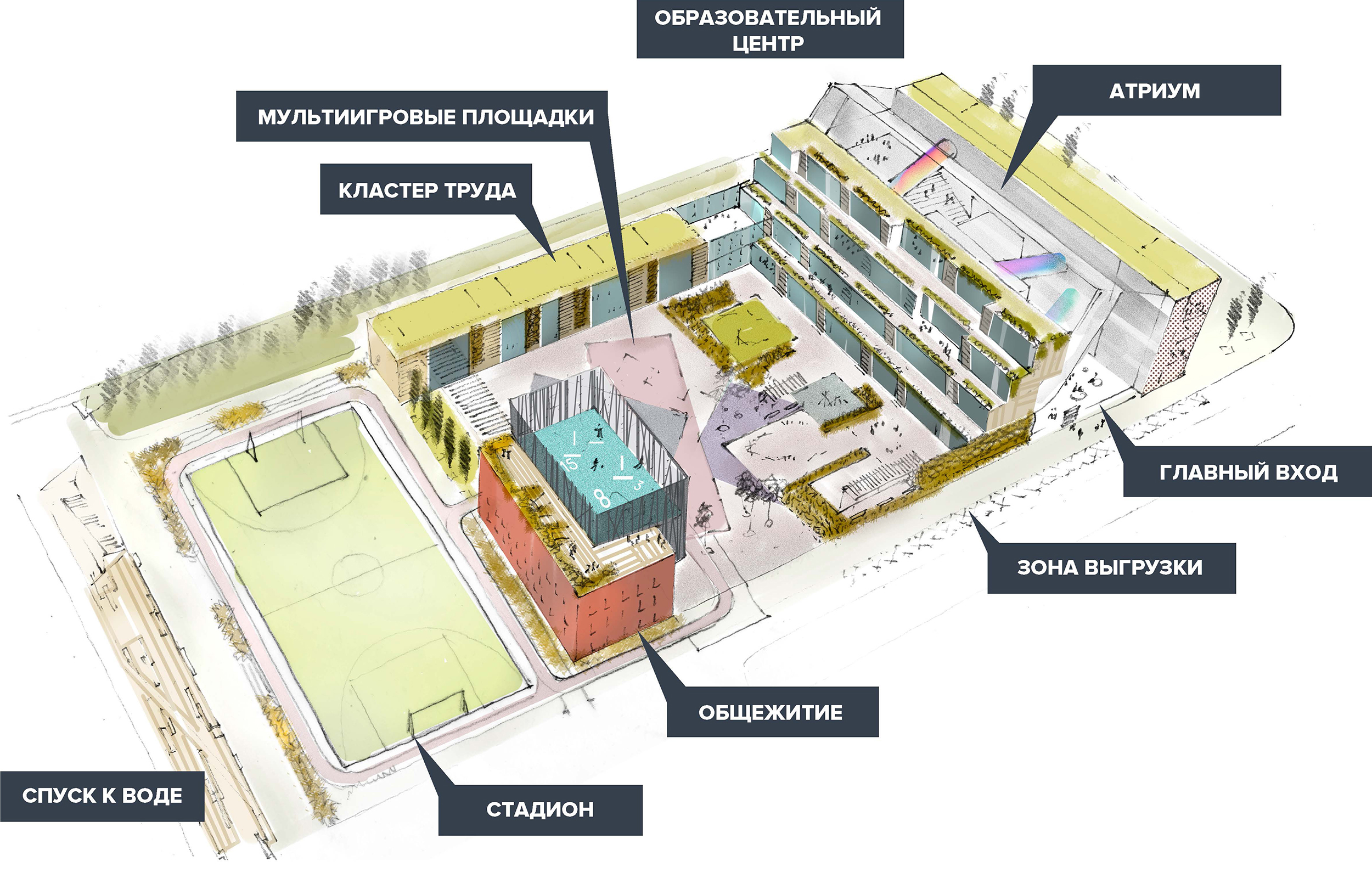 Главный фасад образован сборкой компьютерных классов, естественно-научных лабораторий, актовым и спортивным залами, а по наземному этажу - кабинетами менеджеров, классами робототехники. Все эти помещения, наполненные людьми и деятельностью на протяжении всего дня и вечера формируют городской облик образовательного центра.