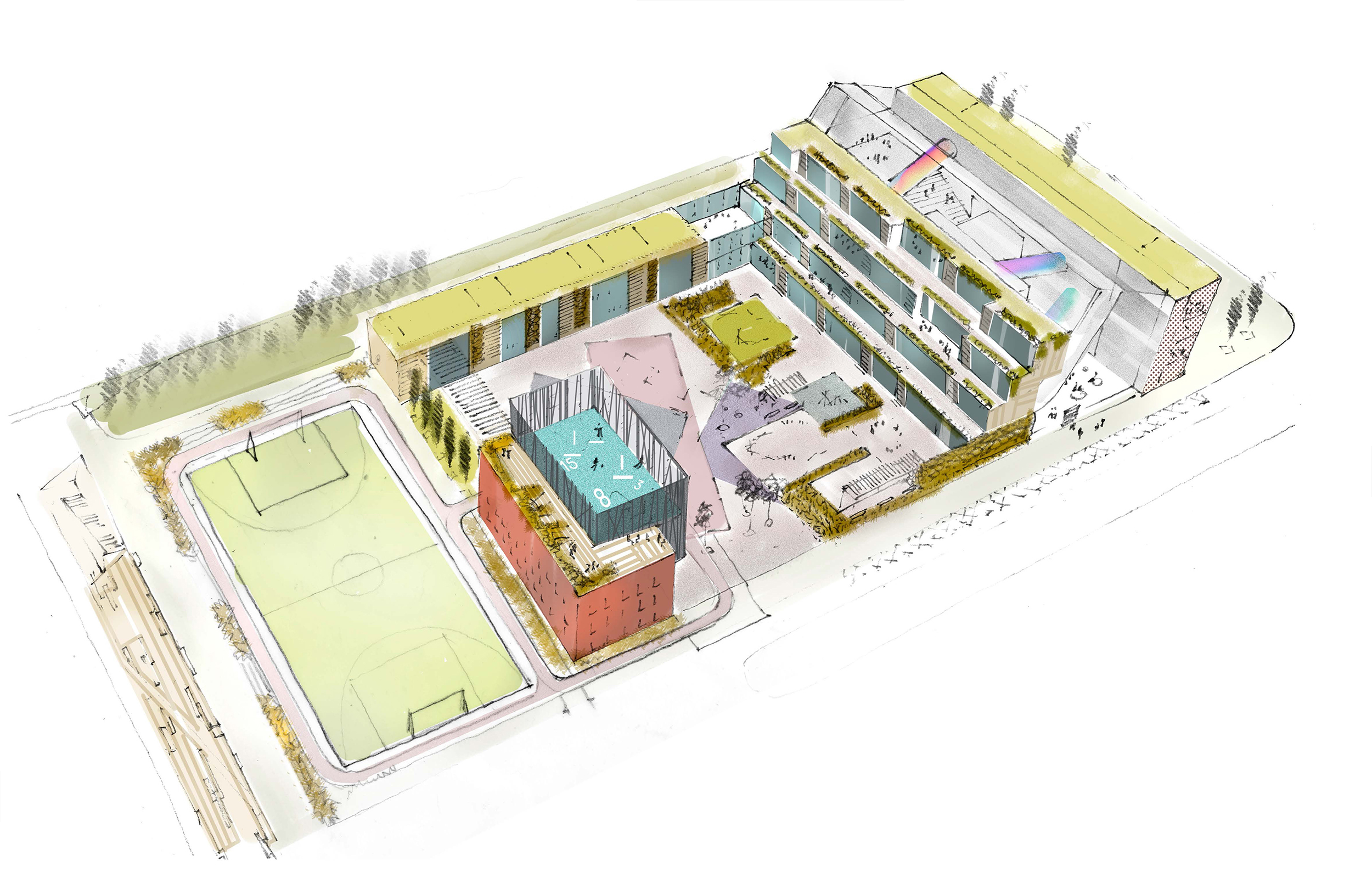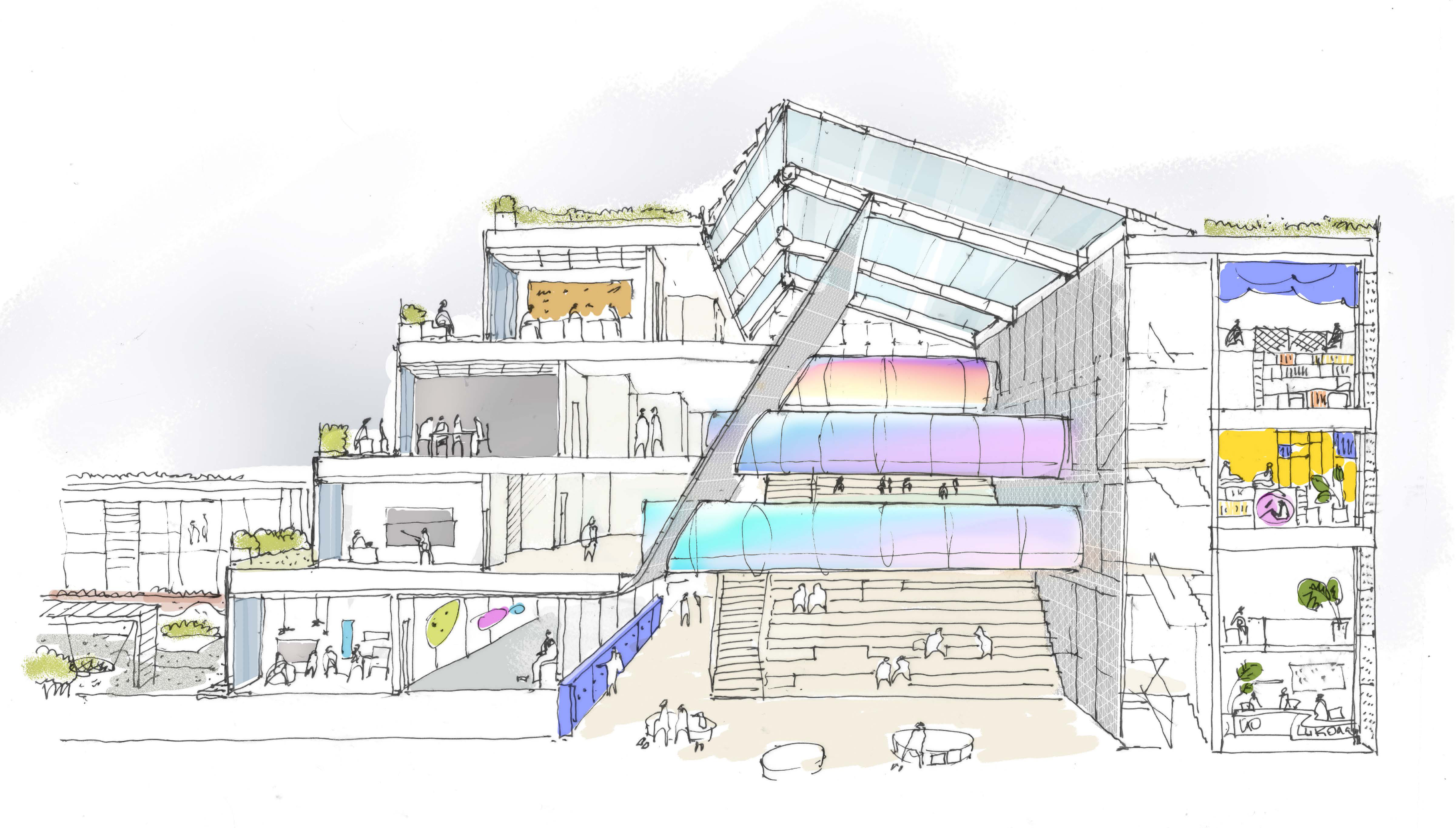Классы начальной и средней школы образуют склон, обращенный к реке и школьному двору. Уступы склона, в свою очередь, образуют террасы с выходом из рекреаций и из каждого класса - можно проводить занятия на свежем воздухе или просто раскрыть остекление для доступа свежего воздуха в класс. Классы и игровая начальной школы в наземном этаже выходят непосредственно на наружные площадки начальных классов школьного двора.